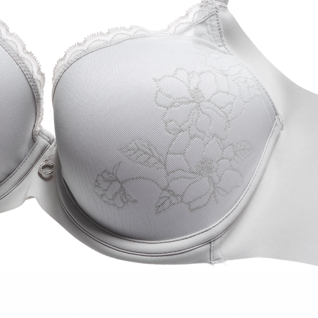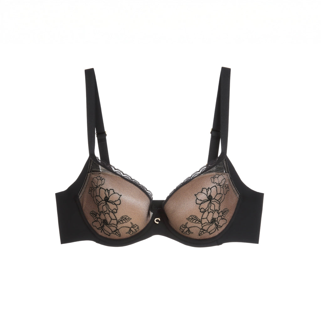 - 罩杯面繡上玉蘭花刺繡並以輕薄網紗覆蓋,清雅秀麗