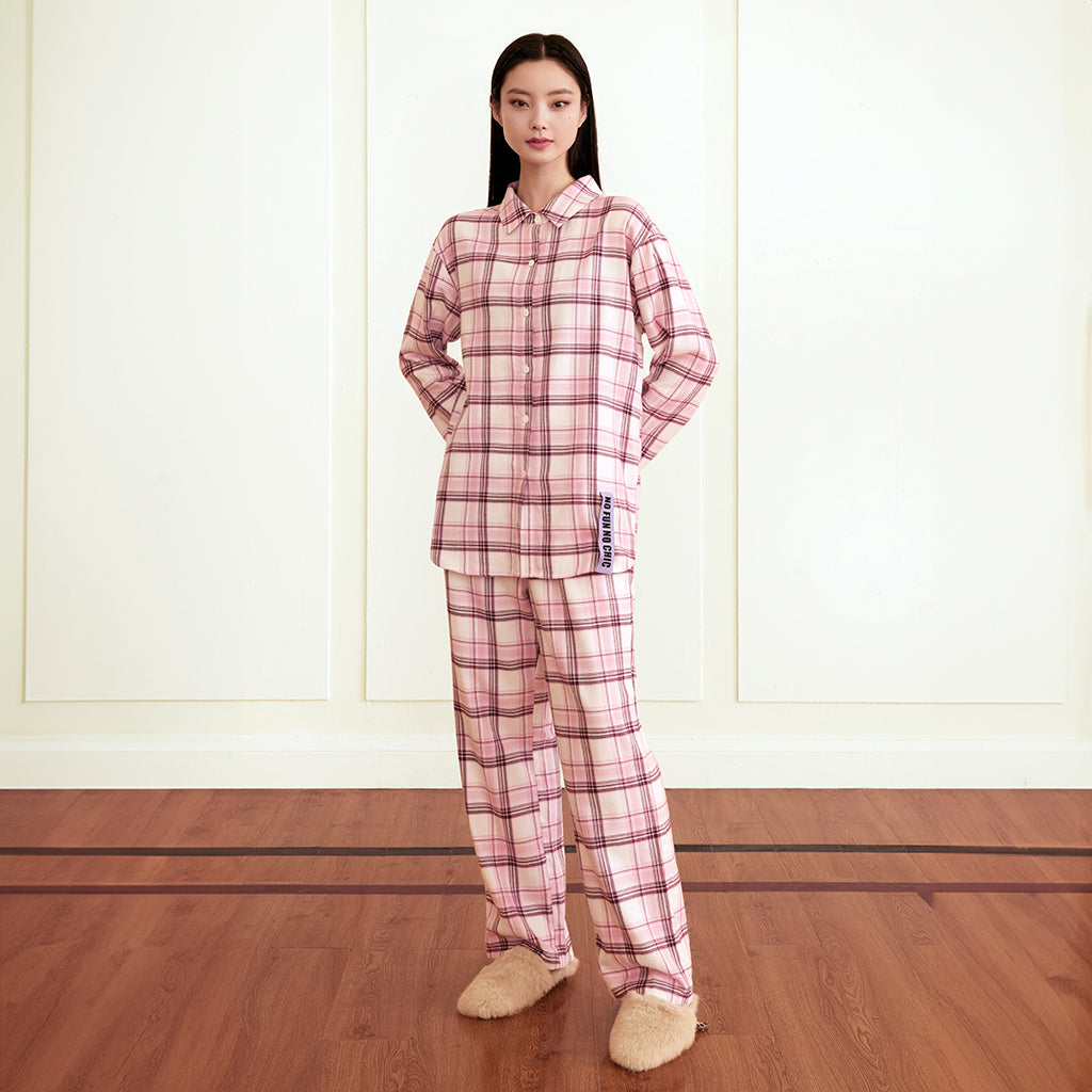 【悠閒生活】純棉格仔睡衣套裝 - 長袖上衣及長褲